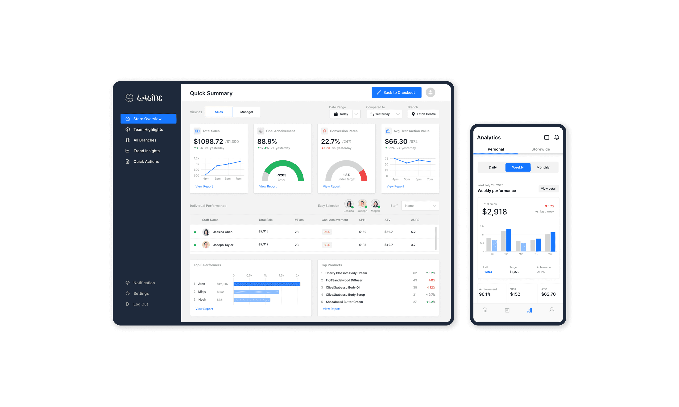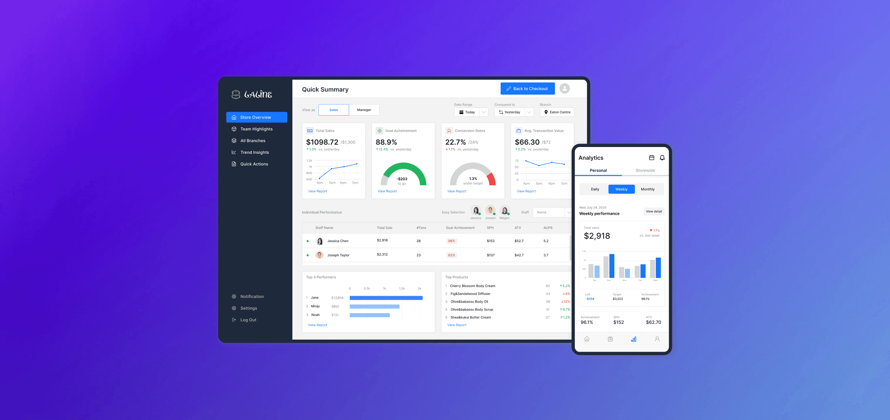 Access live performance data anywhere — desktop for managers in the back office, mobile for associates on the floor. Real-time sync across all devices.